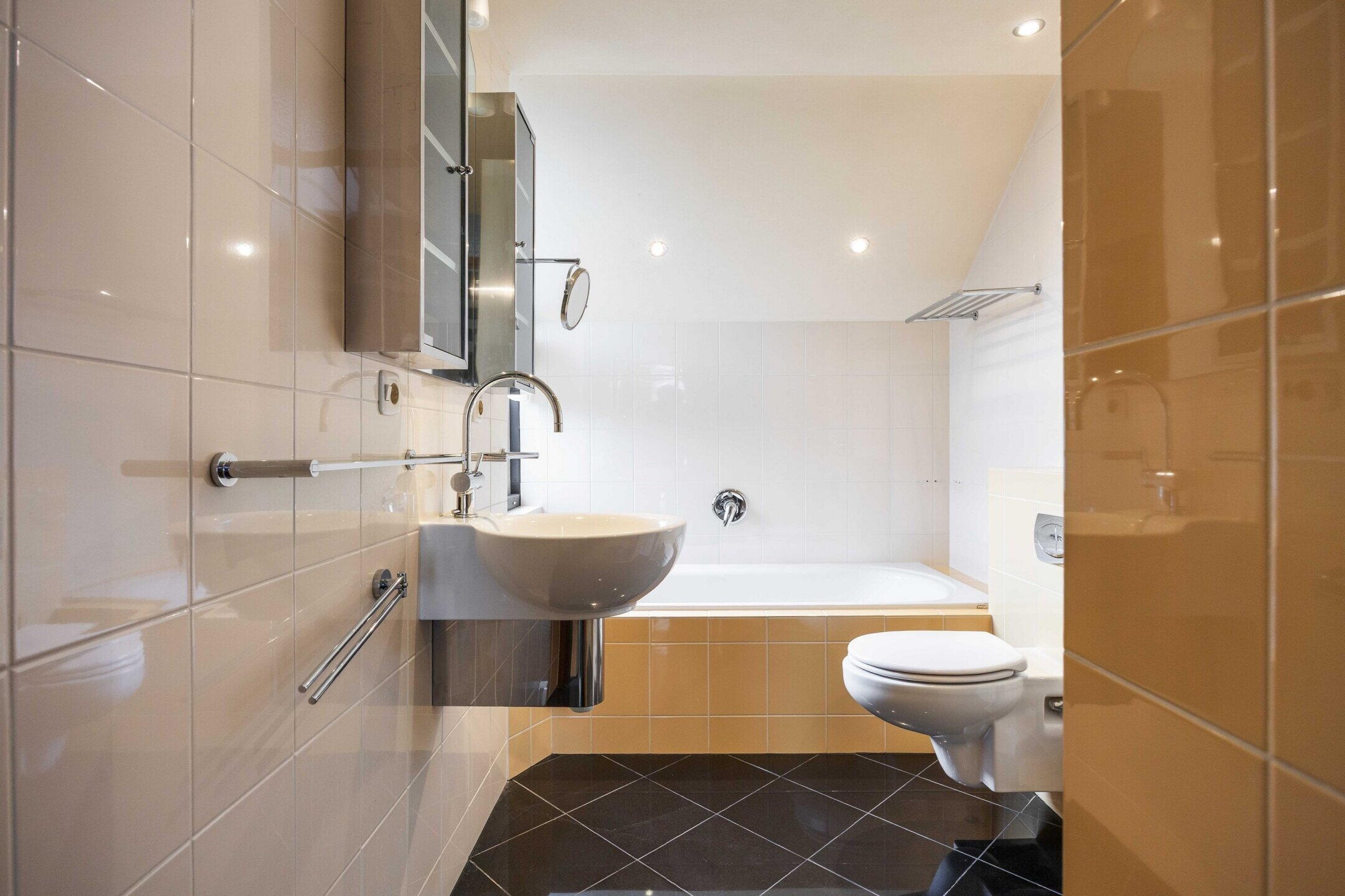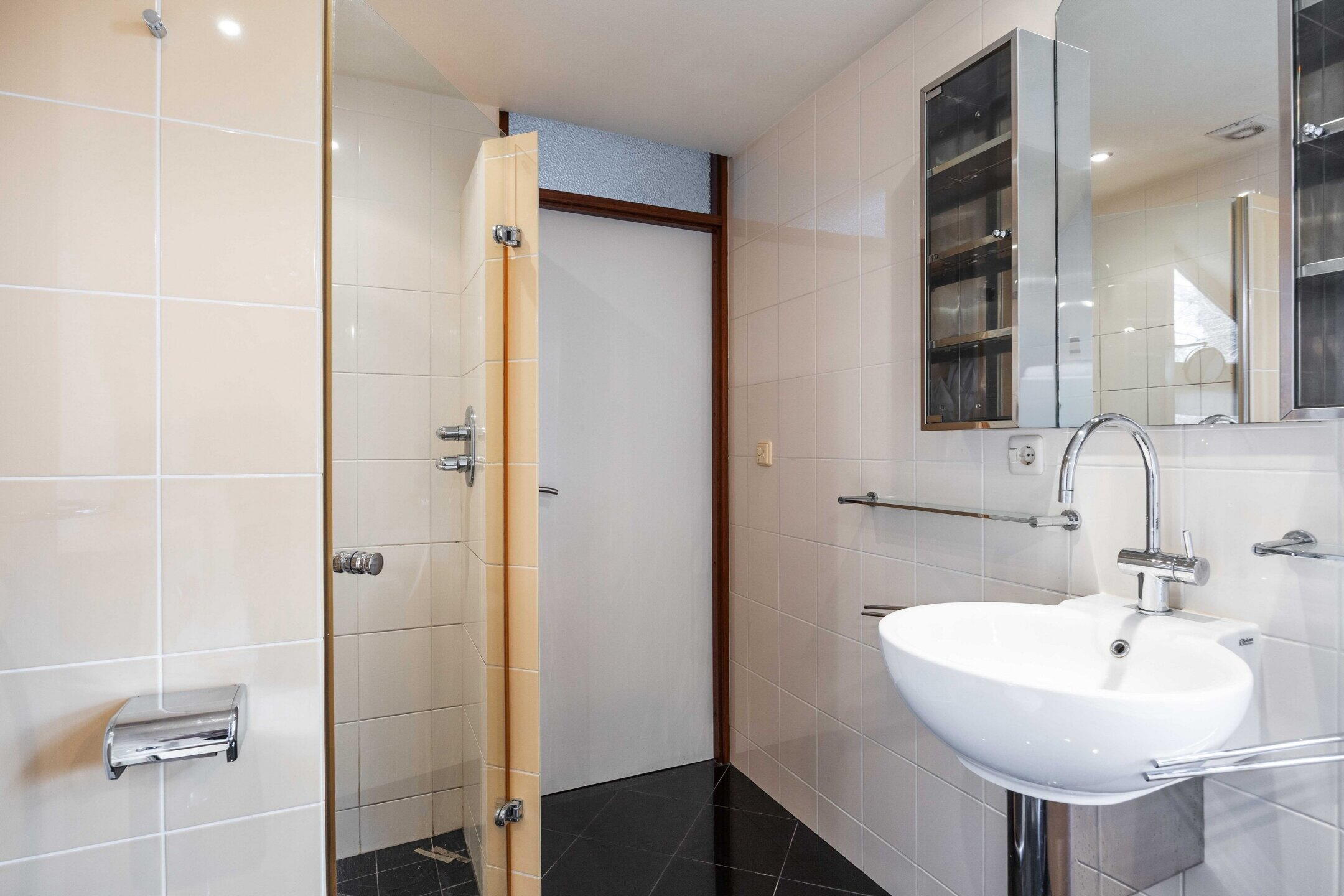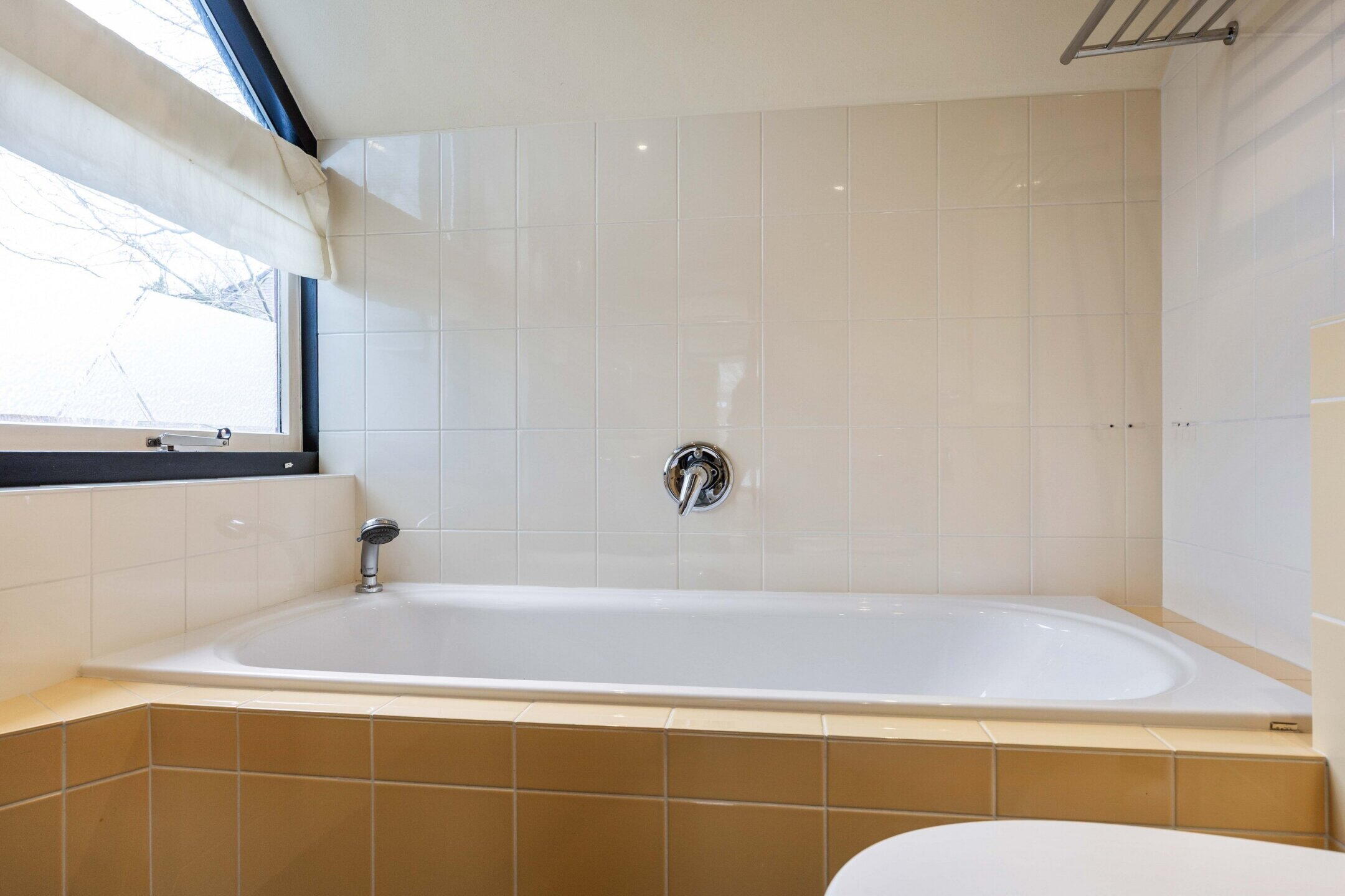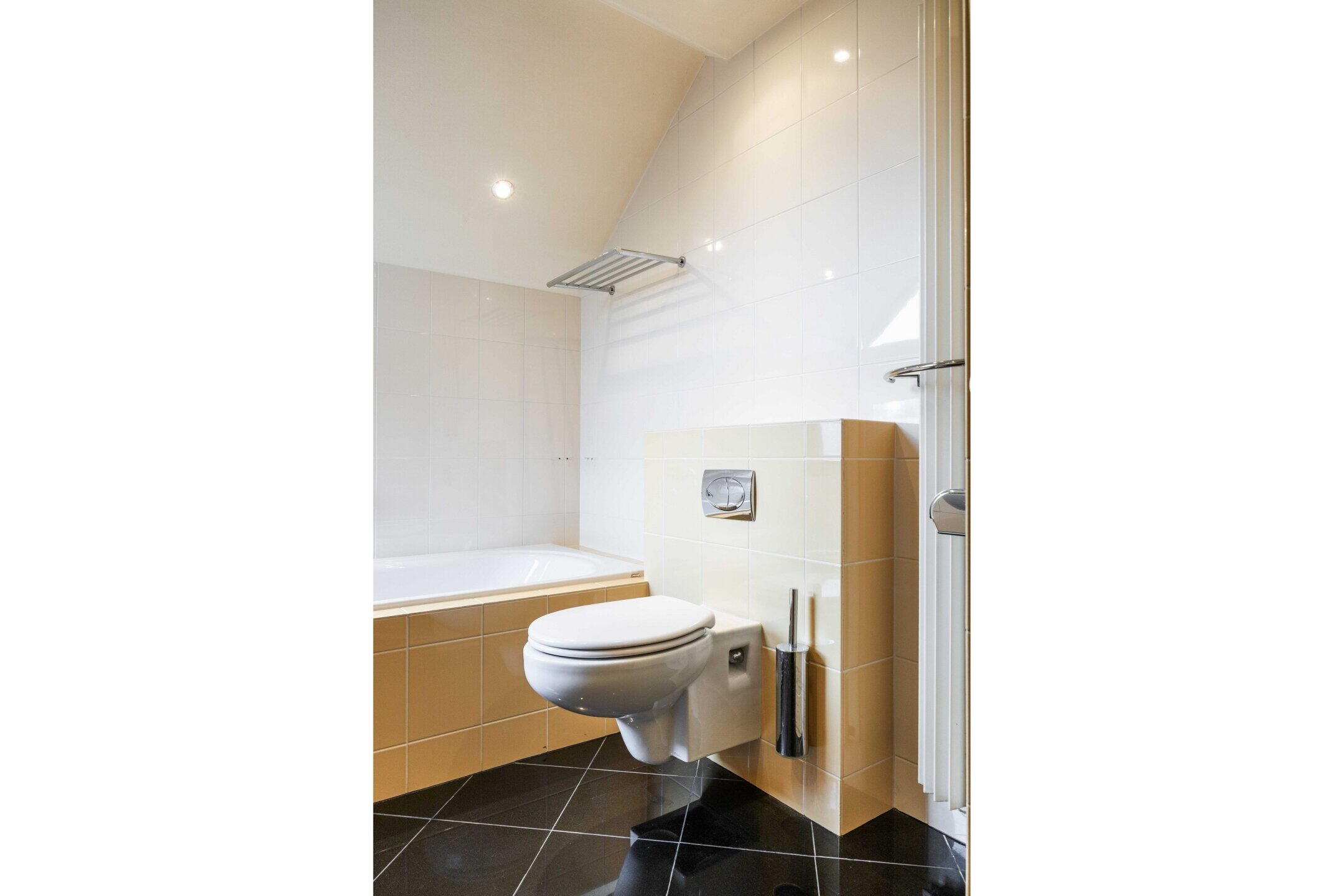 Op de eerste verdieping vind je een overloop, badkamer met douche, ligbad, wastafel en 2e toilet en een enorme slaapkamer met glazen gevel en inbouwkasten. Verder is er nog een tweede ruime slaapkamer aan de voorzijde en een vaste trap naar de bovenste verdieping.